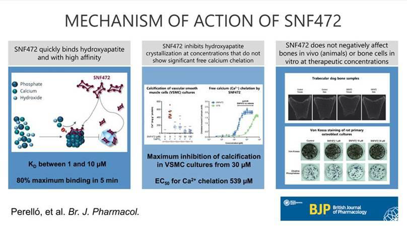 En pacientes sometidos a diálisis, la calcificación vascular ocurre cuando el calcio y el fosfato se agregan en cristales de hidroxiapatita (HAP) y se depositan en las paredes arteriales. Los cristales de HAP bloquean las arterias pequeñas de la piel y los tejidos blandos. El SNF472 se une con alta afinidad a los cristales de HAP, la etapa común final de los procesos de CVC, e inhibe selectivamente su acumulación en las paredes arteriales independientemente de la etiología de la formación de HAP.